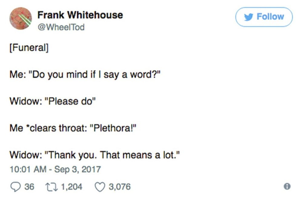 D On Twitter At A Funeral Me I D Like To Say A Word Widow Please Do Me Clears Throat Plethora Widow Thank You That Means A Lot
